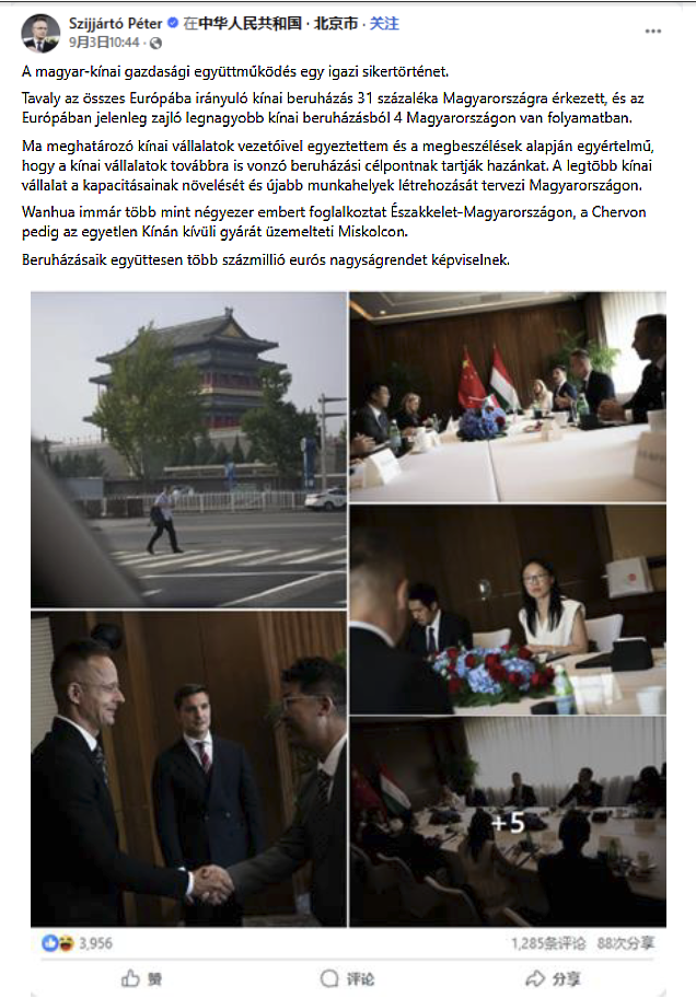 西雅爾多在結(jié)束與中國(guó)企業(yè)會(huì)晤后,在Facebook上發(fā)表了此次經(jīng)歷,肯定了匈牙利和中國(guó)之間的經(jīng)濟(jì)合作: