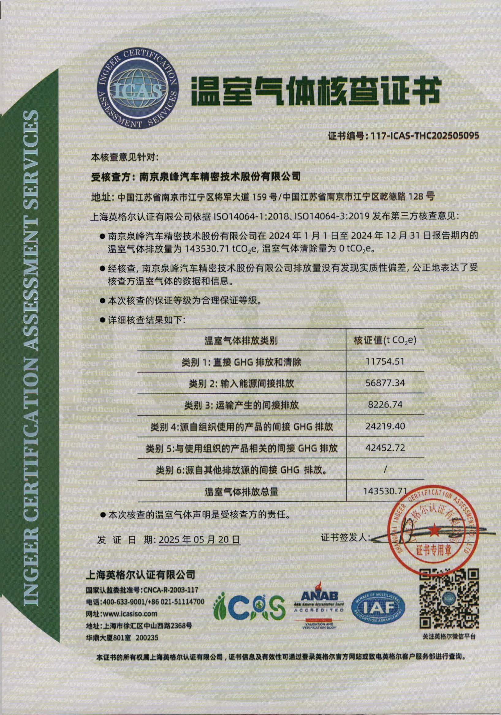 南京泉峰ISO14064證書