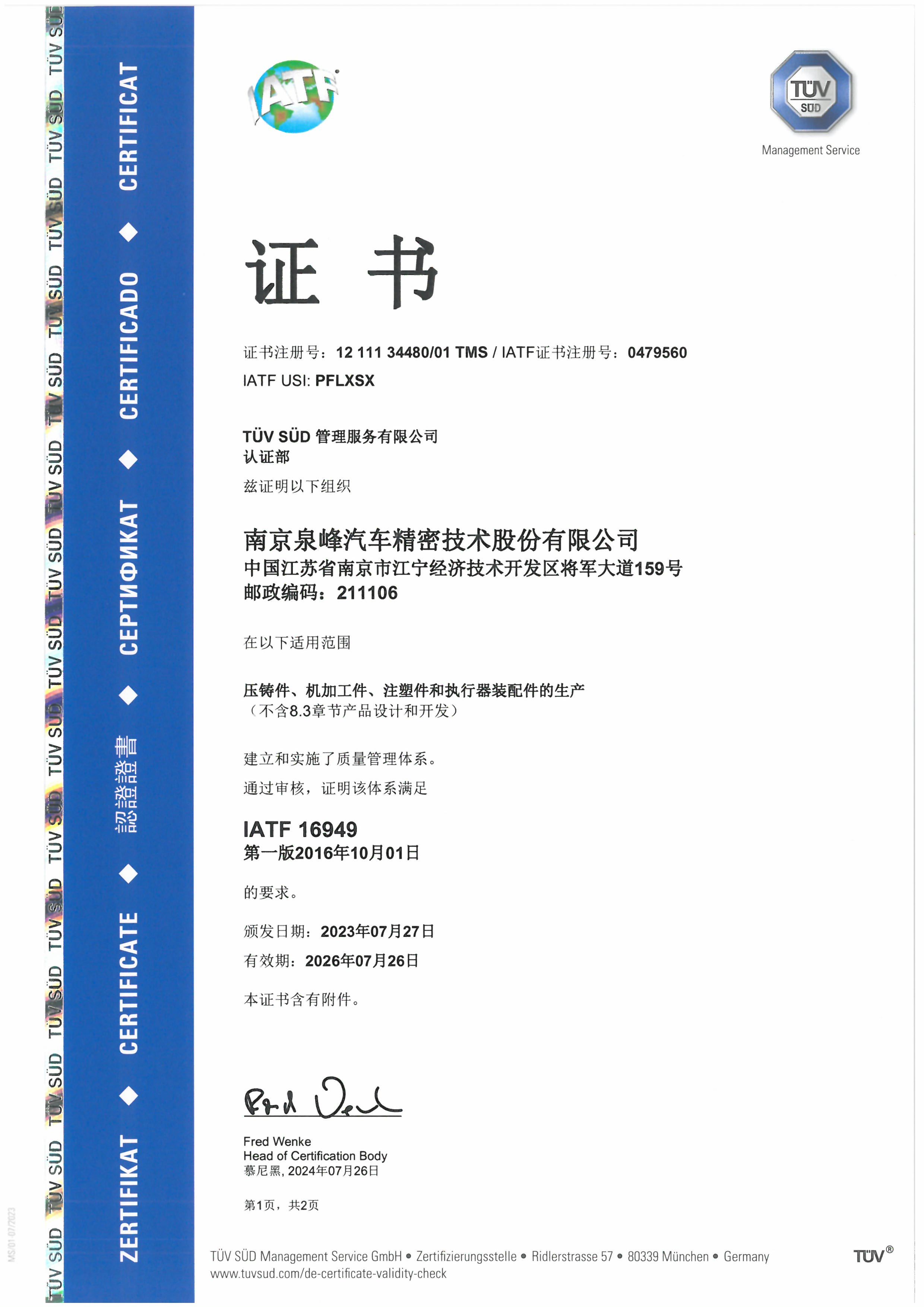 南京泉峰IATF證書